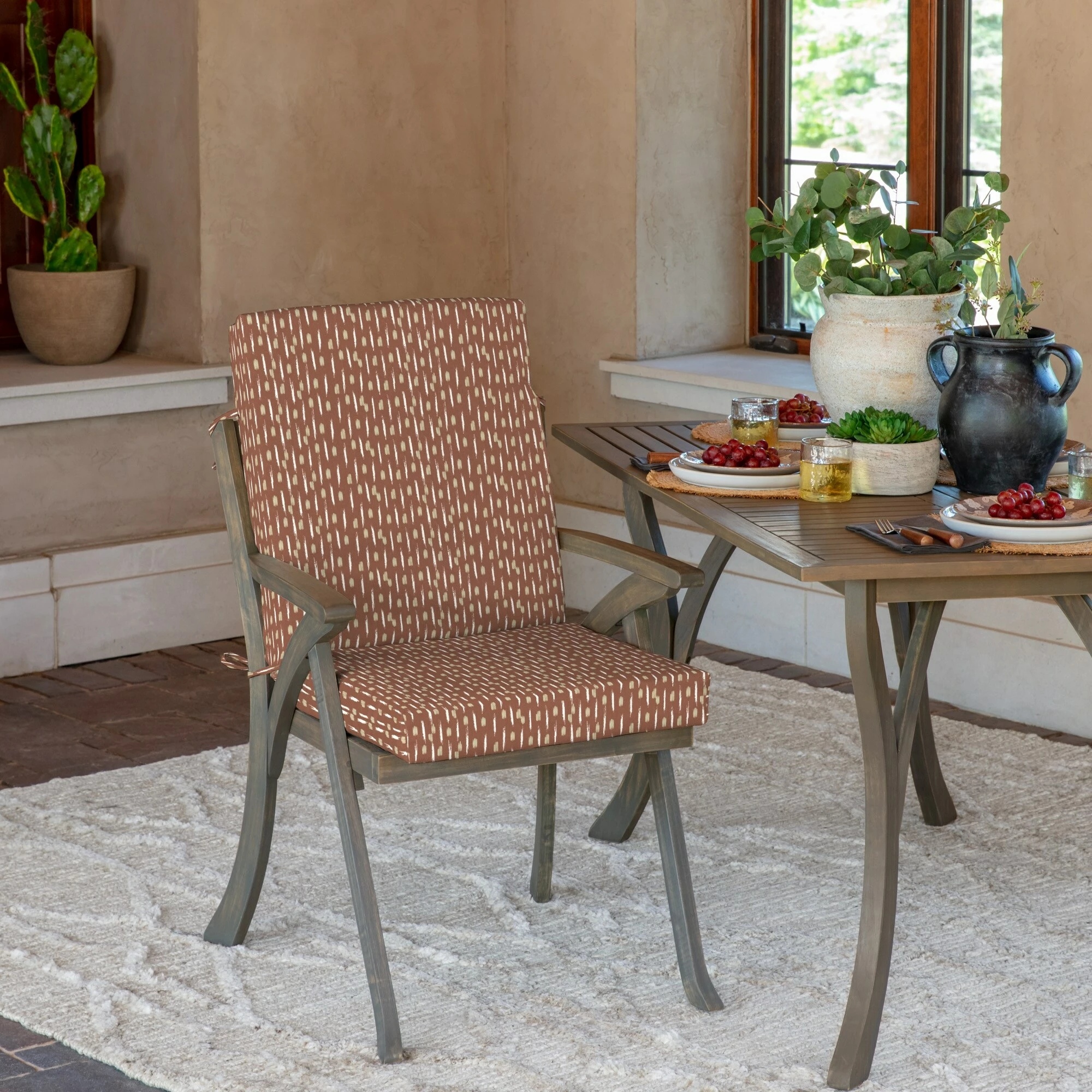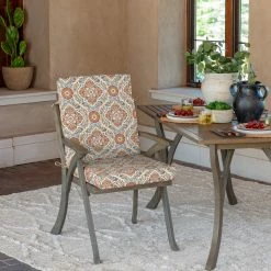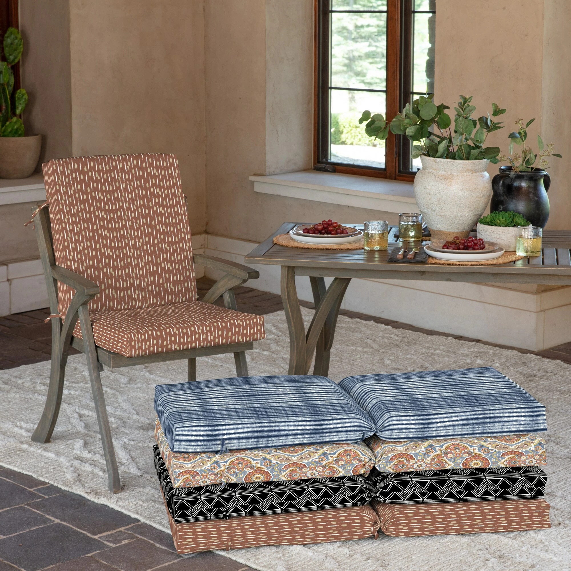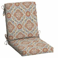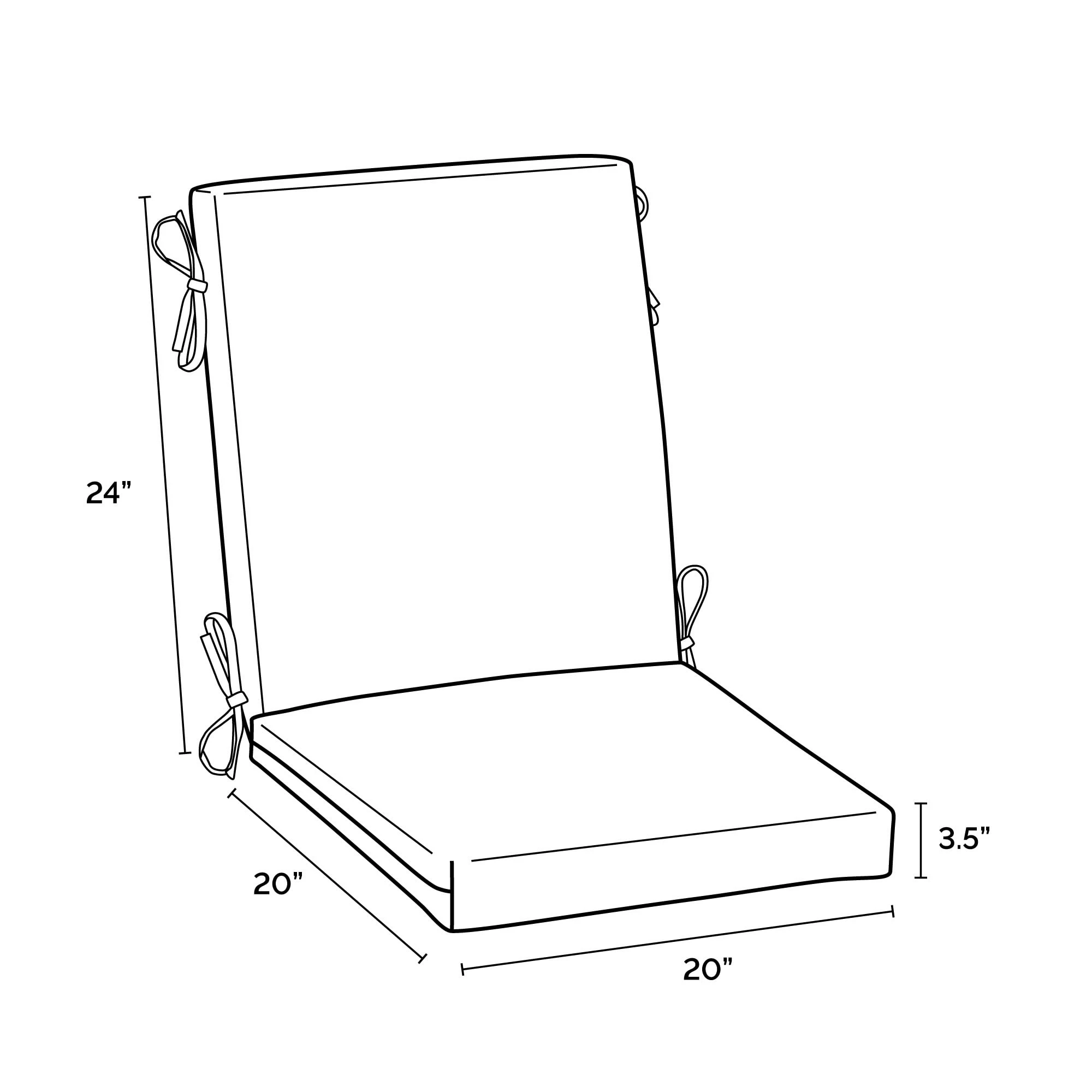 Bring style and comfort to your outdoor living area with this Dining Seat Cushion. This high back patio cushion is 44″ inches long and 20″ inches wide. It is 3.5″ inches thick and has four sets of ties to secure it to the chair. Our EverTru® Printed Polyester outdoor fabric is fade resistant and offers easy cleaning with just soap and water. Inside this outdoor cushion is patented 100% EverLuxe polyester fiberfill to help it retain shape and provide long-lasting comfort during outdoor use. This outdoor cushion is UV treated and is intended for use on your patio or deck; however, we recommend bringing it indoors when it rains or when not in use to preserve its lifespan and keep it looking beautiful.