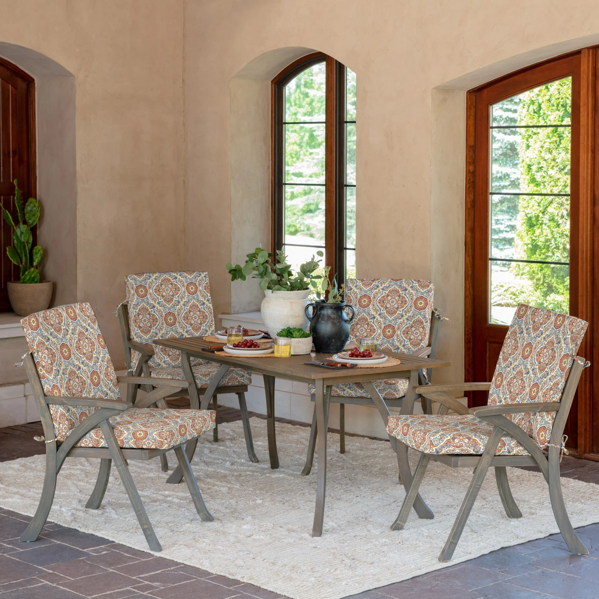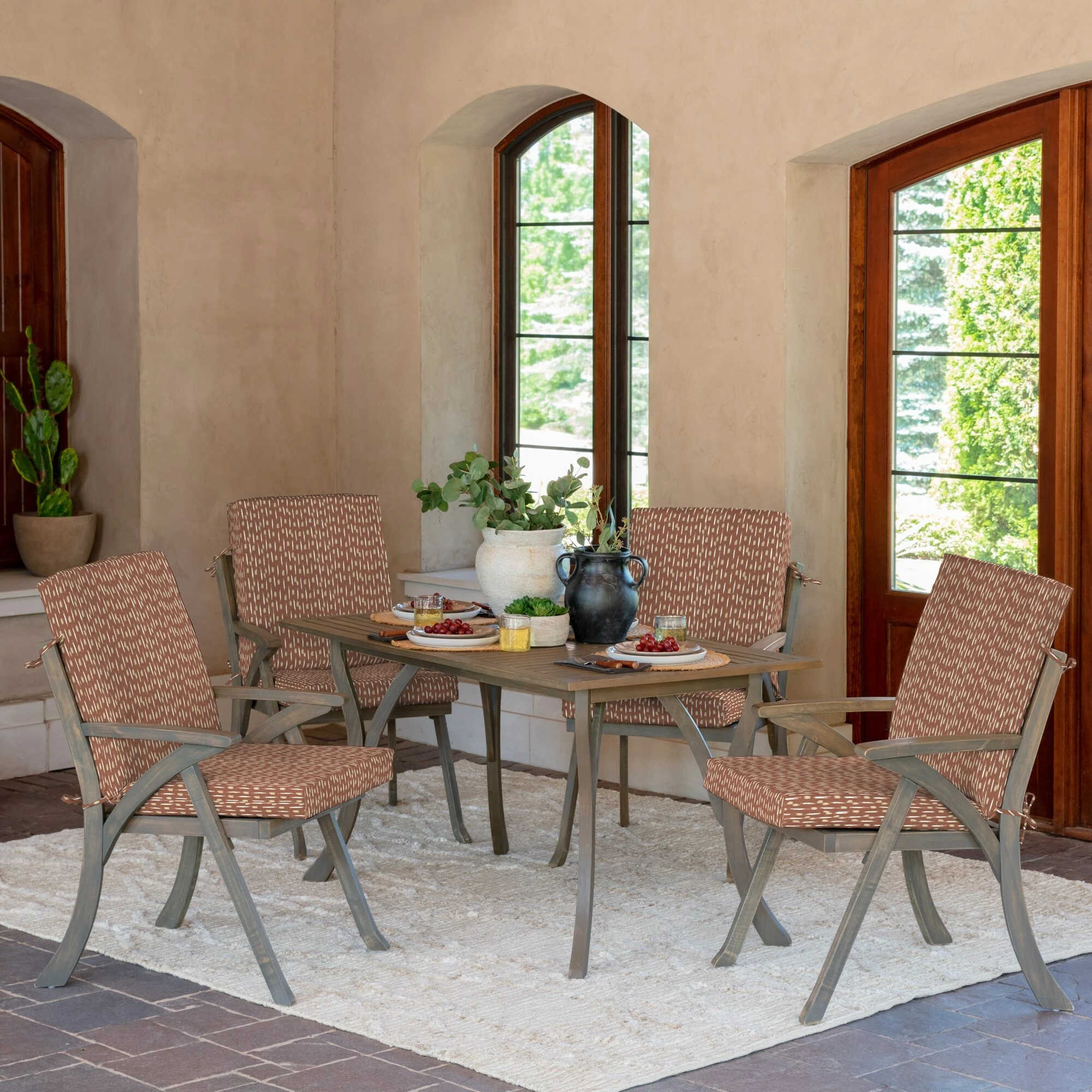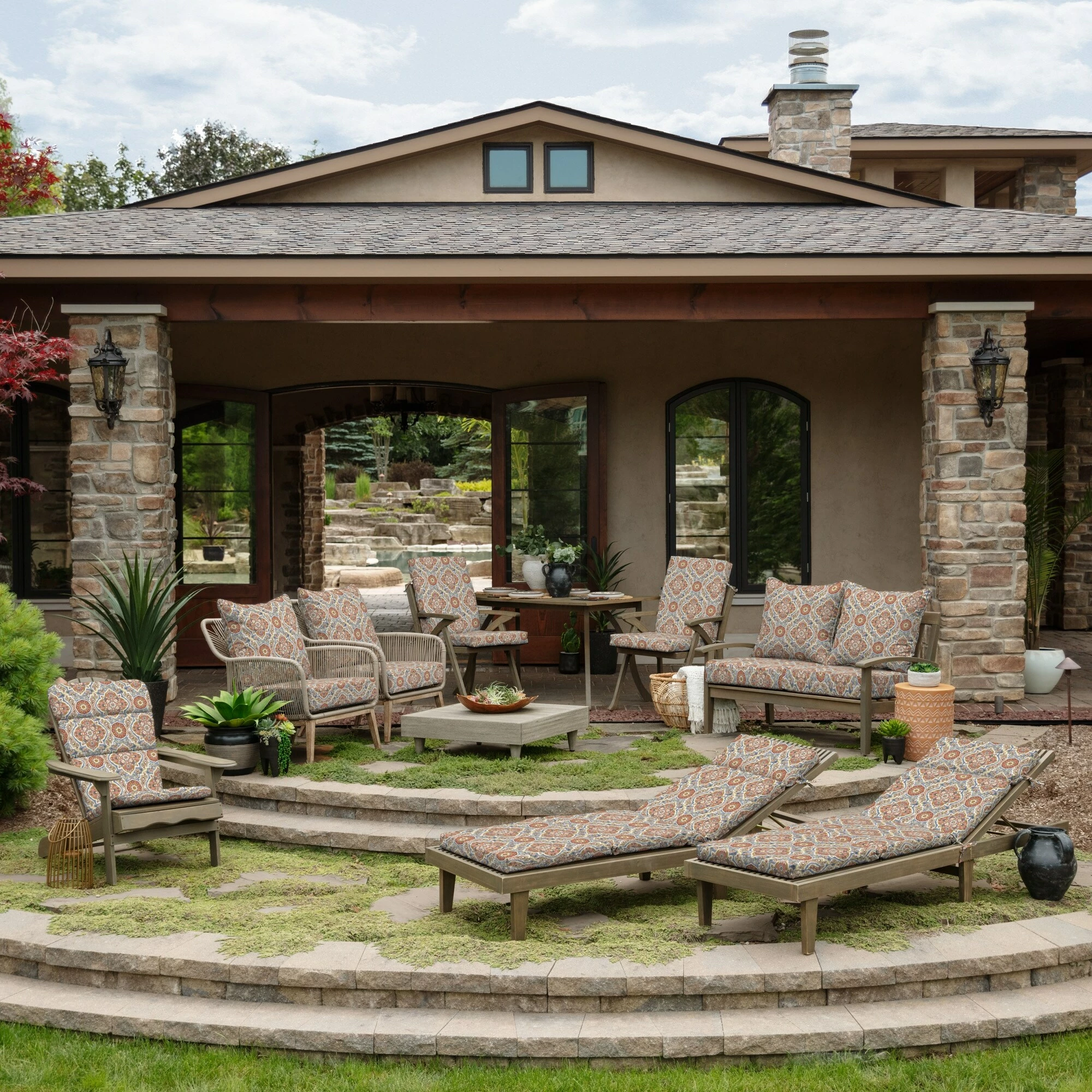 Bring style and comfort to your outdoor living area with this Dining Seat Cushion. This high back patio cushion is 44″ inches long and 20″ inches wide. It is 3.5″ inches thick and has four sets of ties to secure it to the chair. Our EverTru® Printed Polyester outdoor fabric is fade resistant and offers easy cleaning with just soap and water. Inside this outdoor cushion is patented 100% EverLuxe polyester fiberfill to help it retain shape and provide long-lasting comfort during outdoor use. This outdoor cushion is UV treated and is intended for use on your patio or deck; however, we recommend bringing it indoors when it rains or when not in use to preserve its lifespan and keep it looking beautiful.