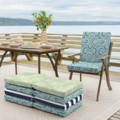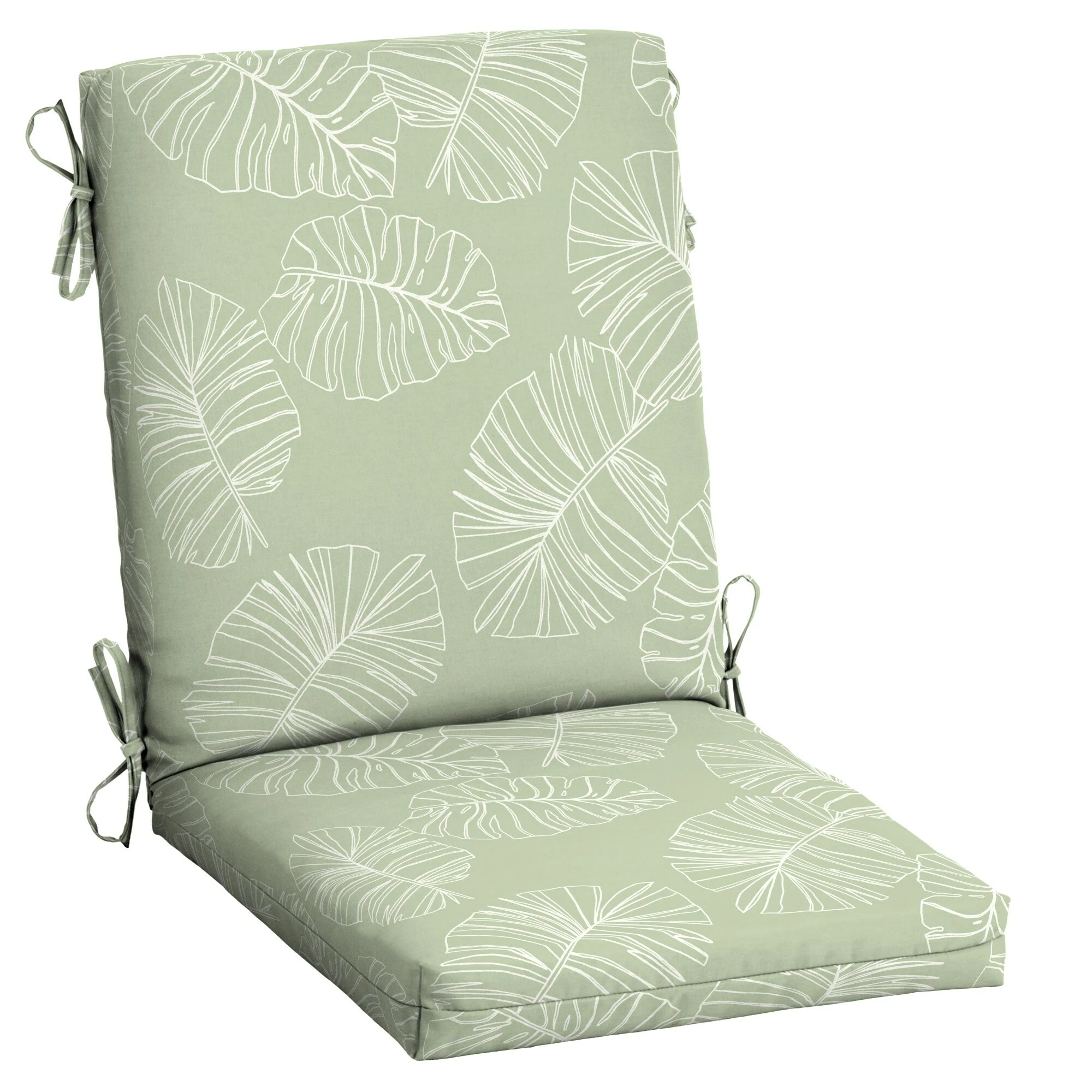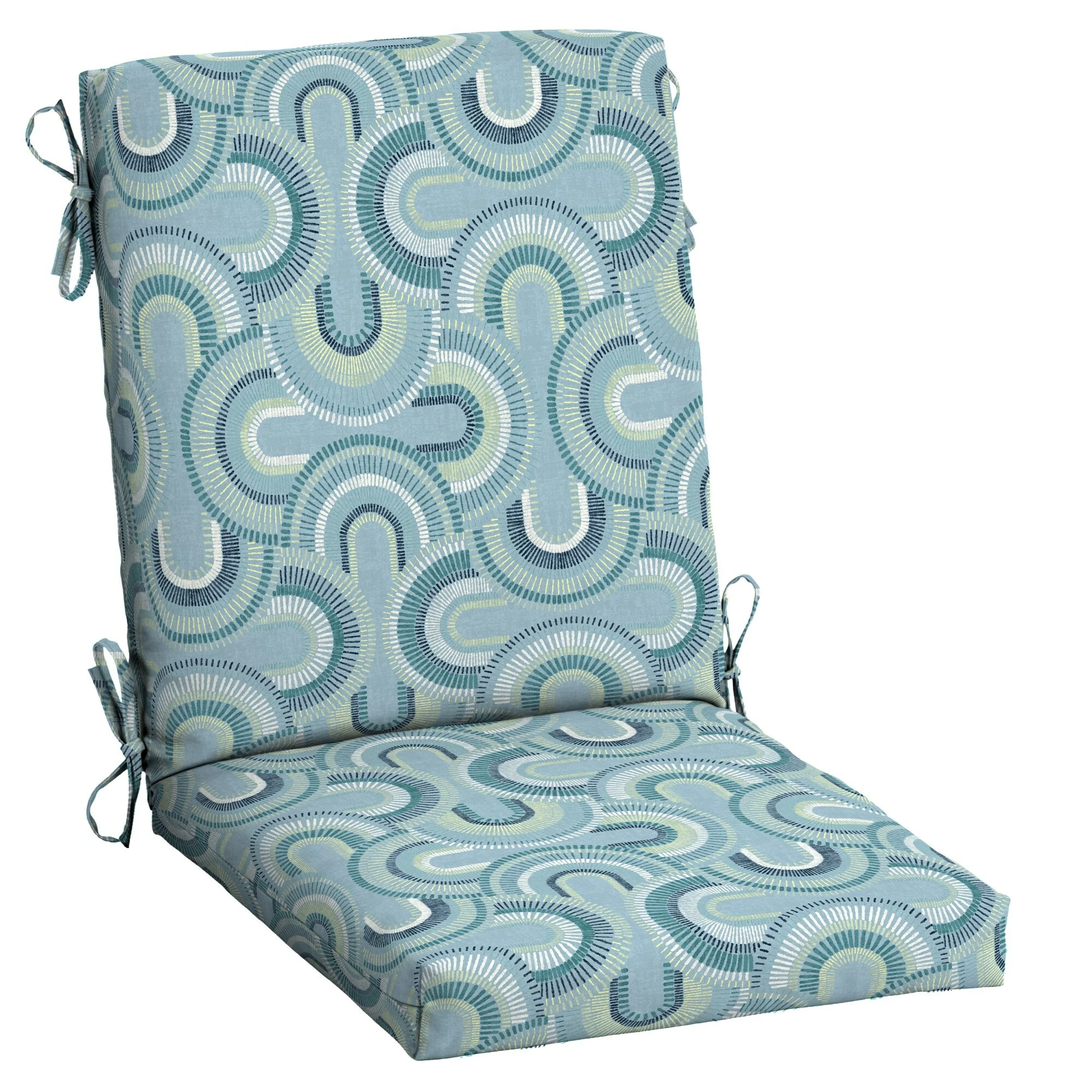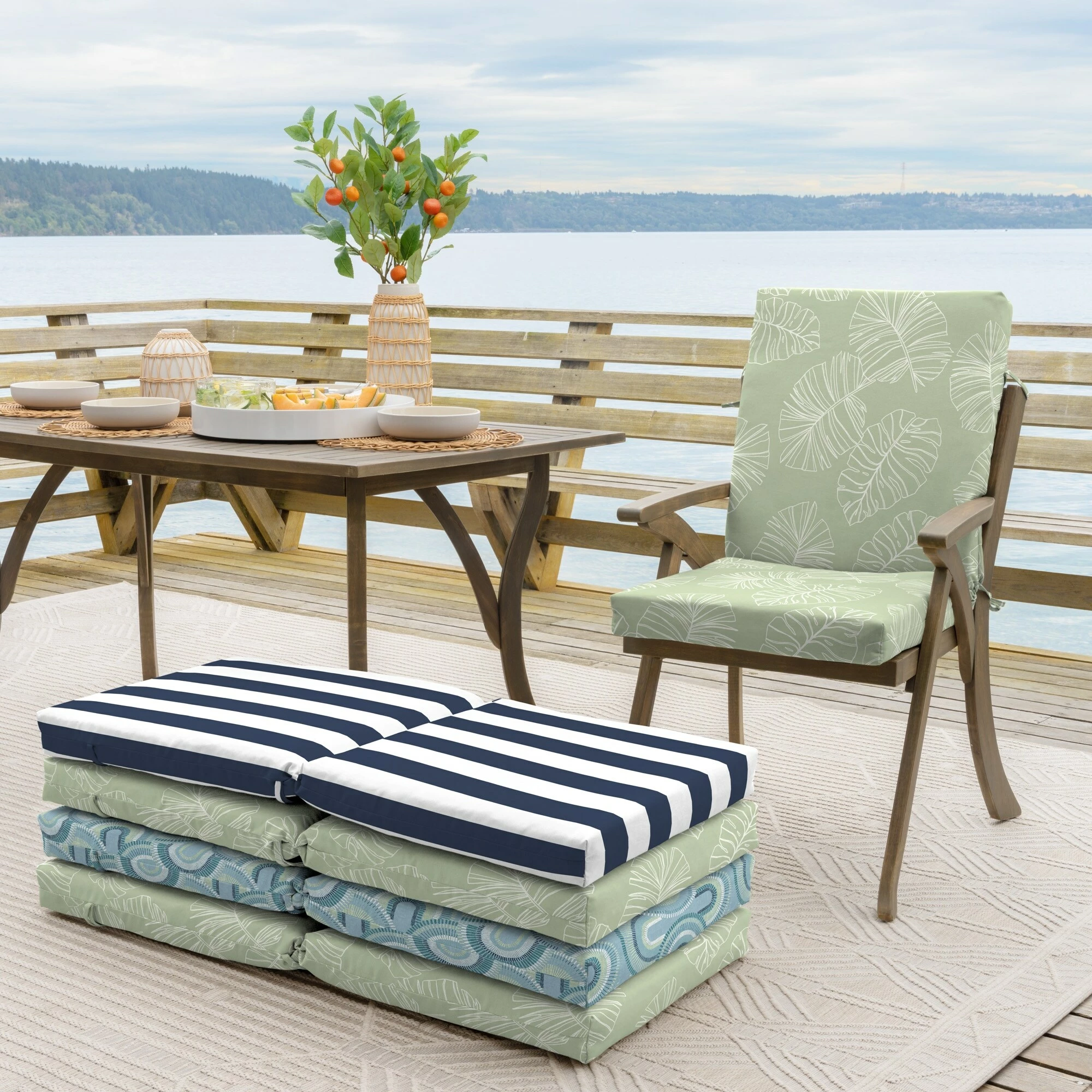 Bring style and comfort to your outdoor living area with this Dining Seat Cushion. This high back patio cushion is 44″ inches long and 20″ inches wide. It is 3.5″ inches thick and has four sets of ties to secure it to the chair. Our EverTruยฎ Printed Polyester outdoor fabric is fade resistant and offers easy cleaning with just soap and water. Inside this outdoor cushion is patented 100% EverLuxe polyester fiberfill to help it retain shape and provide long-lasting comfort during outdoor use. This outdoor cushion is UV treated and is intended for use on your patio or deck; however, we recommend bringing it indoors when it rains or when not in use to preserve its lifespan and keep it looking beautiful.