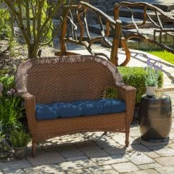The Arden Selections Outdoor Wicker Settee Cushion will help put the finishing touches on your wicker settee or bench! This settee cushion features 6 tufts and is filled with durable polyester blowfill, which gives it a luxuriously full look and also allows you to fluff it up at any time. The cushion measure 41.5″W x 18″L x 5″T and has two sets of ties, allowing it to fit a variety of outdoor wicker settees and benches. Pair this cushion with Arden Selections wicker seat cushions in matching or coordinating colors to pull your entire wicker furniture set together.The durable, weather-resistant polyester fabric ensures vibrant colors through the season and offers easy cleaning with just soap and water. We use 100% polyester fill inside our wicker cushions to help retain shape and maintain long-lasting comfort and support during outdoor use. This outdoor cushion is UV treated and is intended for use on your patio or deck, however we recommend bringing it indoors when it rains or when not in use to preserve its lifespan and keep it looking beautiful.