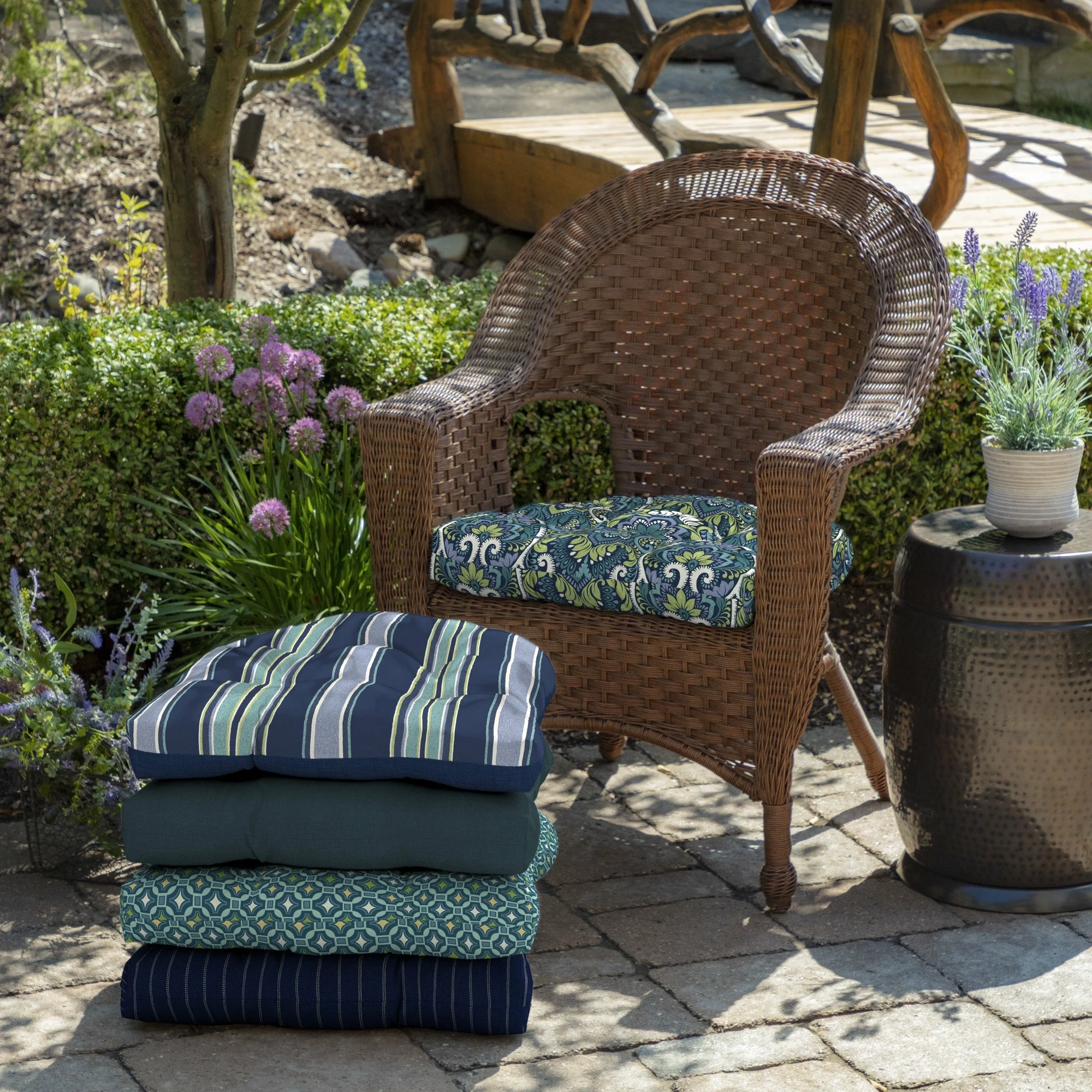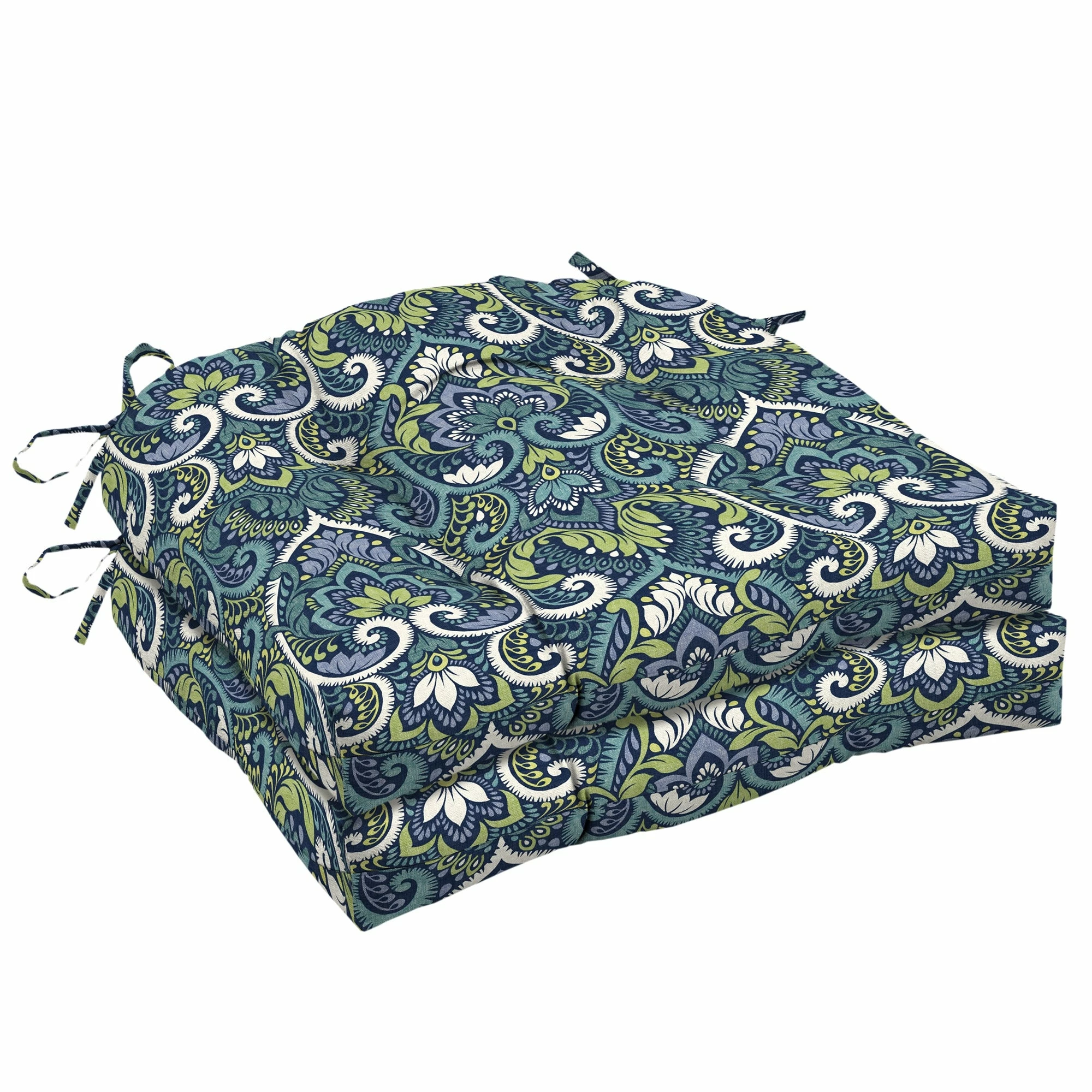 Animate your outdoor lounging area with the beautiful damask design of this pack of two seat cushions. The polyester blowfill offers easy comfort, and the weather-resistant fabric holds up to the elements. Each cushion comes with two sets of ties that allow you to keep it firmly in place.